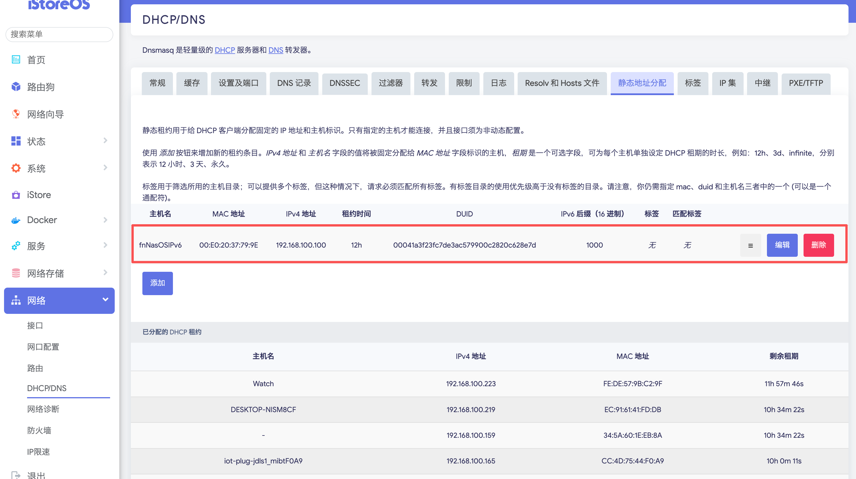 ###OpenWrt 将飞牛映射的地址改为固定静态ip(例::1000)